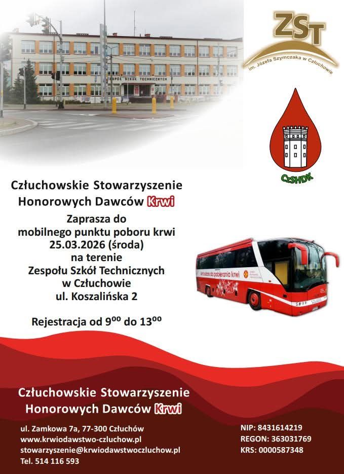 📌 Człuchowskie Stowarzyszenie Honorowych Dawców Krwi zaprasza do mobilnego punktu poboru krwi: